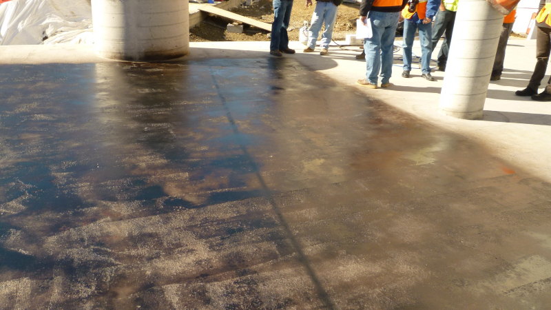 The first coat of rubberized bitumen is applied to the concrete deck in a continuous fashion and at an average thickness of 3 mm. The first coat of membrane is then completely covered with a 1000 mm wide fabric reinforcing; each joint overlapped a minimum of 50 mm. A final 3 mm thick coat of membrane is applied to cover the fabric. The average thickness of the two coats must be 5 mm, with no readings less than 4 mm.